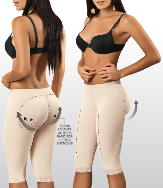These shaper shorts are constructed from a special fabric which helps to enhance and lift the buttocks, creating an ideal shape. Decorated with floral trim around the thighs. Silicone Lace. Capri-Pant. Strong Control in abdomen, contours waist and thighs. No control in the butt area to avoid flattening. Lined compression hip shaping. Tummy control and bottoms lifter. Made from extra soft fabric for added comfort. Textile: Exterior: 85% Nylon 15% Spandex |